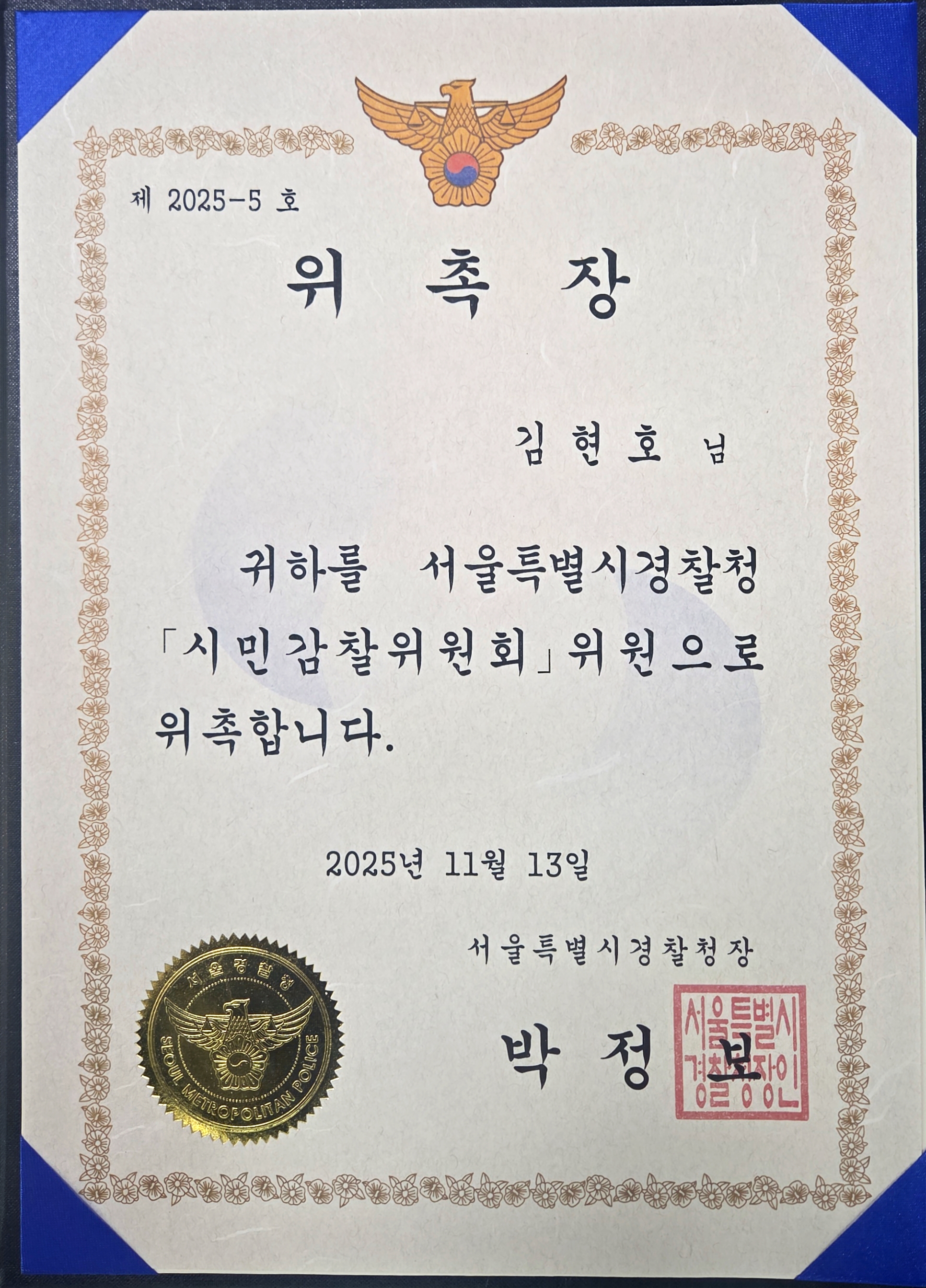 법무법인 이제의 김현호 변호사가 2025. 11. 13. 자로 서울특별시경찰청 시민감찰위원회 위원으로 신규 위촉되었습니다.