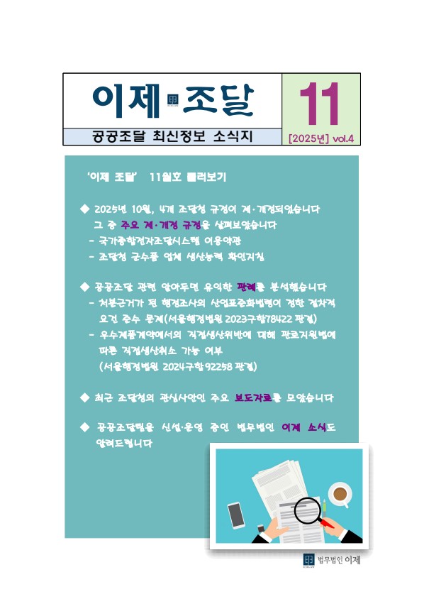 <이제 조달> 11월호에서는 2025년 10월 제개정된 4개 조달청 규정 중 '조달청 군수품 업체 생산능력 확인지침' 등 주요 규정에 대한 설명과 최근 서울행정법원에서 '우리법원 주요판결'로 소개된 법무법인 이제 승소판결인 '우수제품계약에서의 직접생산위반에 대해 판로지원법에 따른 직접생산취소 가능 여부' 등에 대한 판례 분석 및 조달청 보도자료 중 꼭 알아야 할 주요 보도자료 등을 선별하여 수록하였습니다.